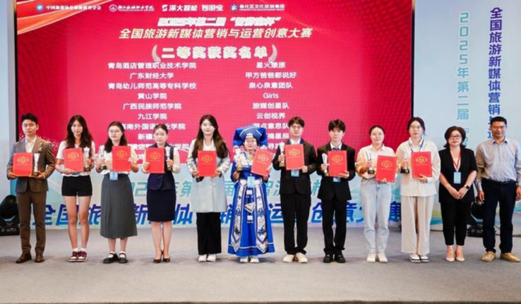 本网讯(文旅学院 张翊)6月8日,2025年第二届“智游宝杯”全国旅游新媒体营销与运营创意大赛决赛在宁波落幕,文旅学院2024级旅游管理专业学生黄丽娟、薛蕙君、孔纯、肜嘉怡、刘彩云团队凭借出色表现荣获二等奖。